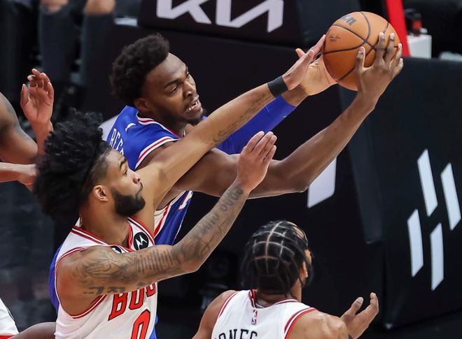 第四節(jié)決戰(zhàn),布澤利斯轉換三分再中,公牛將分差縮小至個位數(shù)。馬克西突破拋投打進還造成追尾犯規(guī),再次站出來穩(wěn)定軍心。吉迪突分助攻奧科羅命中三分,拿下生涯第20次三雙。恩比德連續(xù)單打失誤,三分強投三不沾,吉迪強硬上籃再打進,公牛追至1分分差(最高落后24分)。馬克西強投三分不中,武切維奇大空位接吉迪傳球,三分手起刀落,完成準絕殺。最終,76人111-113慘遭24分大逆轉,公牛豪取2連勝,東部第一易主。