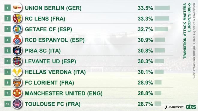 CIES(瑞士足球天文臺)統(tǒng)計了五大聯(lián)賽球隊在攻防轉換階段球隊進攻時間的占比排行。通俗說,在球權轉換階段,球隊可以選擇回傳或者橫傳控制球權,也可以立即發(fā)起進攻。在這項統(tǒng)計中,柏林聯(lián)合占比最高,曼聯(lián)排名第九,是英超打轉換最直接干脆的球隊。